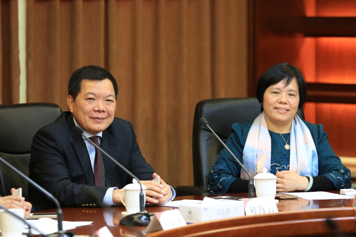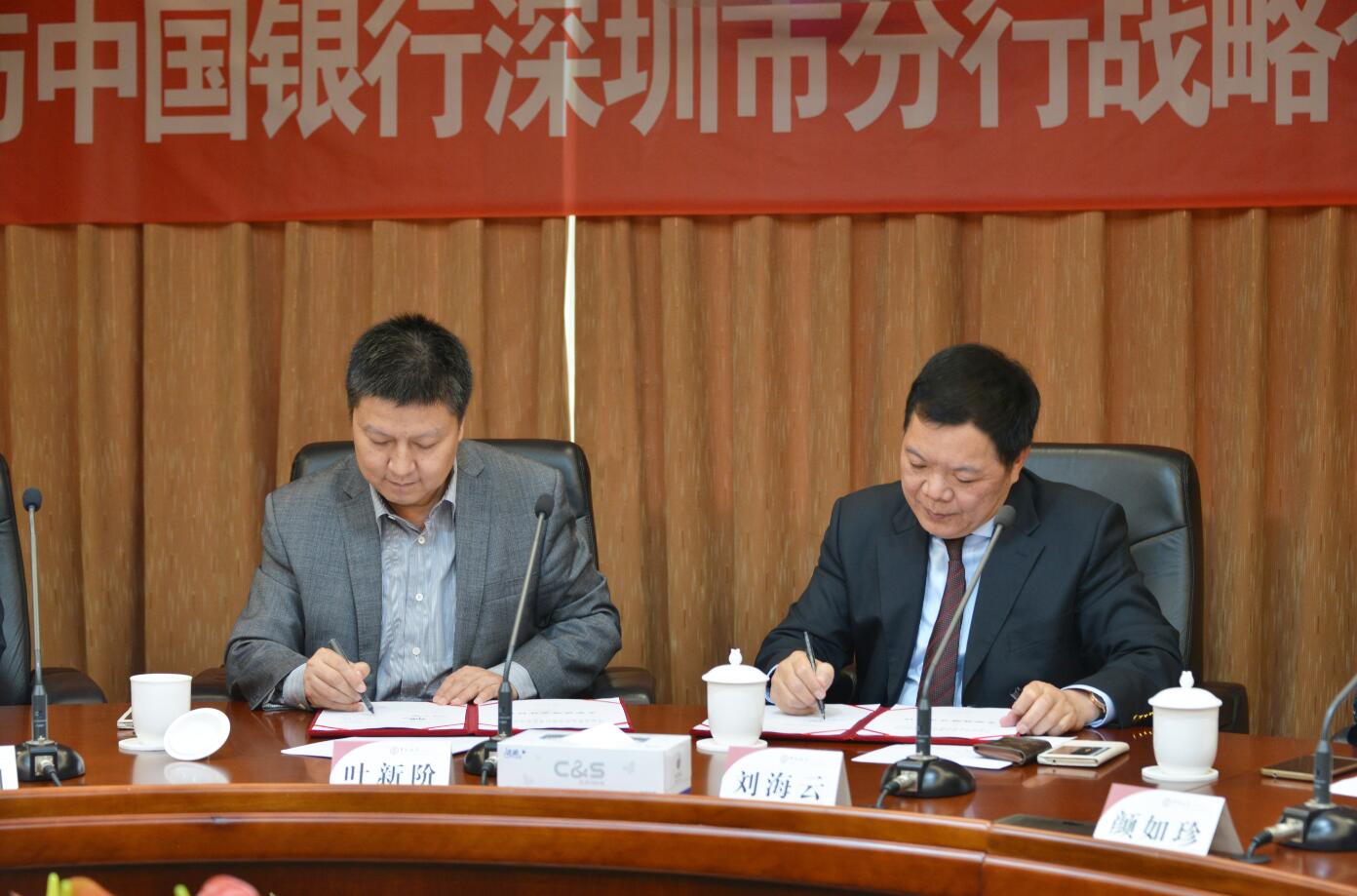 建藝集團董事長兼總裁劉海云(右一)與中國銀行深圳市分行副行長葉新階(左一)