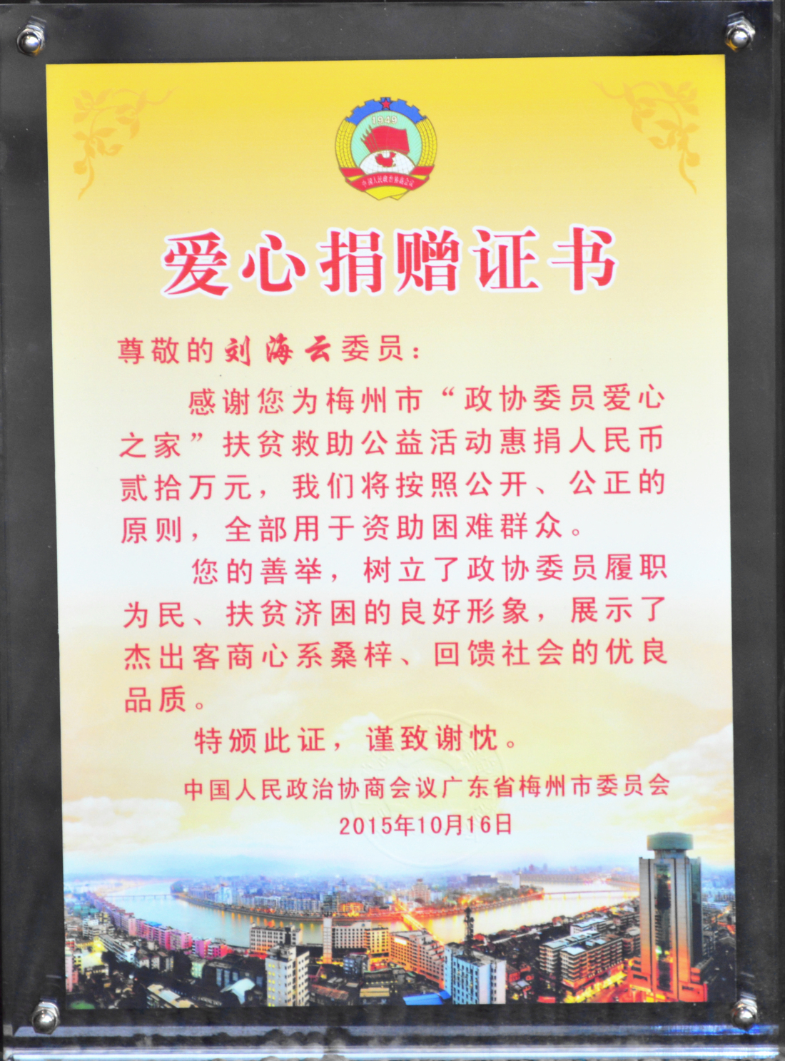 彭副主席代表梅州市政協(xié)向劉海云董事長授予愛心捐贈證書