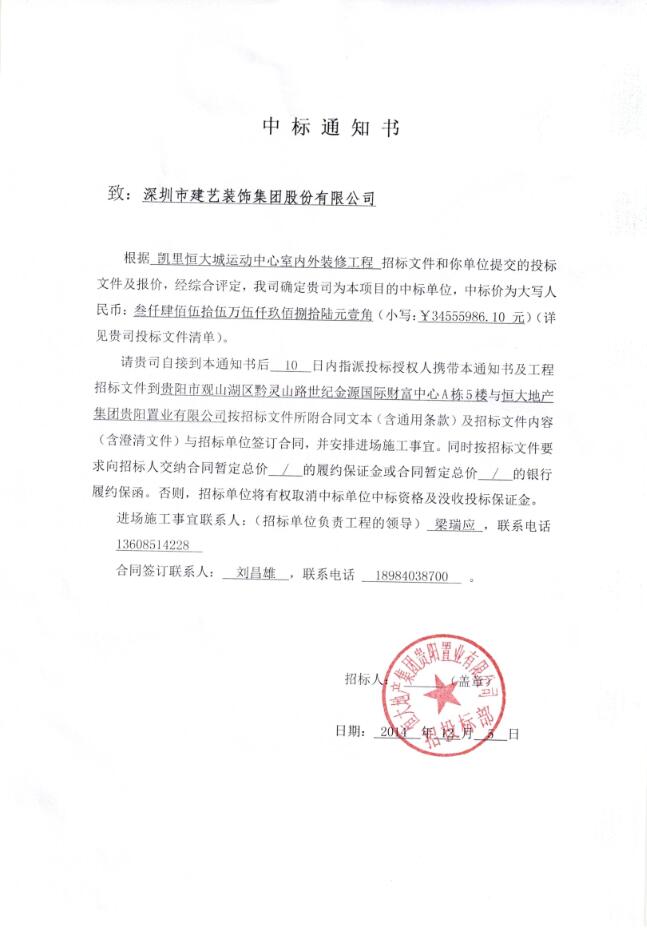 在預算員初報、部門領導二重審核和成本控制下,成控評估中心人員以嚴謹的態度有條不紊的配合完成了報價到裝訂封標等一系列工作任務,最終憑借建藝集團長期戰略合作優勢、優質施工過程保證以及精準的報價,成功實現凱里恒大城運動中心室內外裝修工程中標,總價達3455萬元。