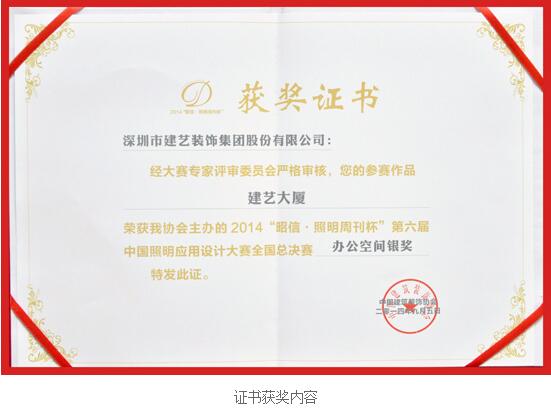 繼7月在中國建筑裝飾協會及中國建筑裝飾與照明設計師聯盟共同主辦的“2014(第六屆)‘照明周刊杯’中國照明應用設計大賽南寧賽區頒獎典禮”上斬獲南寧賽區一等獎后,建藝集團的參賽作品《建藝大廈》在近日再次憑借一流的設計思維與應用理念,獲得了2014“昭信·照明周刊杯”第六屆中國照明應用設計大賽全國總決賽辦公空間銀獎。