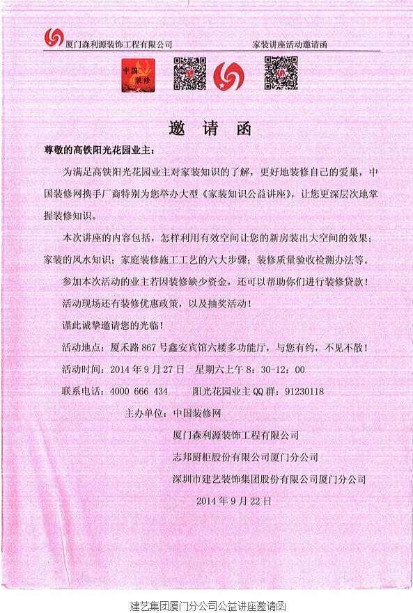 深圳市建藝裝飾集團股份有限公司廈門分公司自成立以來,始終堅持創新經營,開拓發展的新思路。9月22日,廈門分公司為滿足高鐵陽光花園業主了解家裝知識的迫切需求,同時更便捷地為廣大業主提供家裝咨詢服務,特舉辦大型家裝知識公益講座,使業主能夠更深層次的掌握裝修知識,在一定程度上增強對家庭裝修的了解。