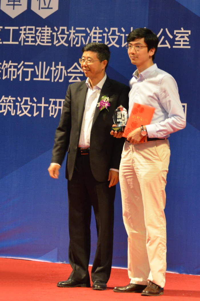 深圳市裝飾行業協會會長高剛為工藝創新金獎獲得者、建藝集團工程總監韓佛(右)頒獎并合影