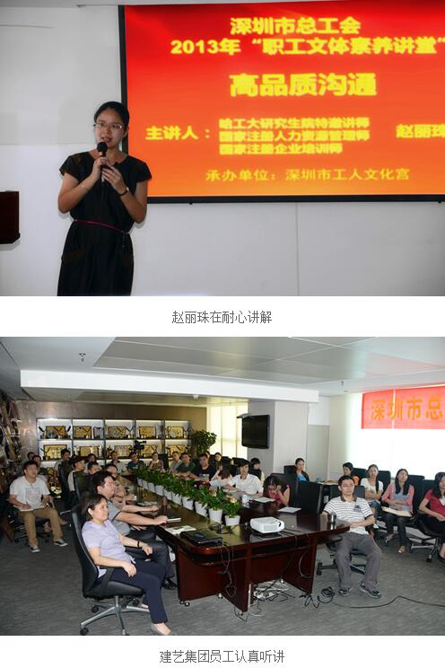為了提升集團總部員工的溝通能力,提高各部門、各個職員的工作效率,2013年6月19日下午,深圳市總工會2013年“職工文體素養講堂”走進建藝集團,并特別邀請哈爾濱工業大學研究生院講師、國家注冊人力資源管理師趙麗珠為集團總部全體員工開展了一次高品質溝通培訓課程。