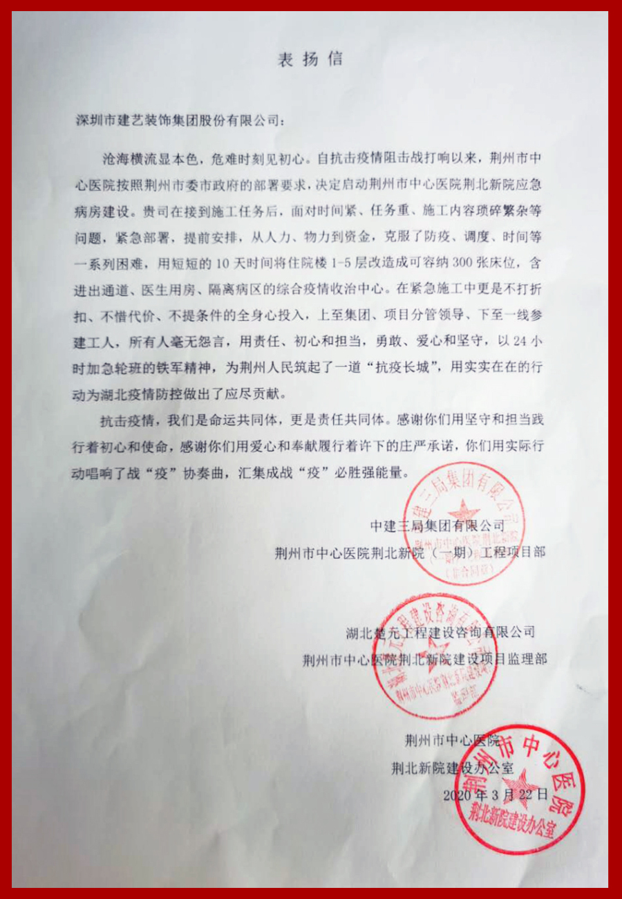 回溯難忘的2月,面對嚴峻的抗疫形勢,接到任務的建藝集團荊州市中心醫院荊北新院應急病房建設團隊,排除了人力、物力、防疫、調度、時間等一系列困難,僅用時10天,成功將住院樓1-5層改造成可容納300張床位,含進出通道、醫生用房、隔離病區的綜合疫情中心,有力支援了荊州的疫情防控工作。