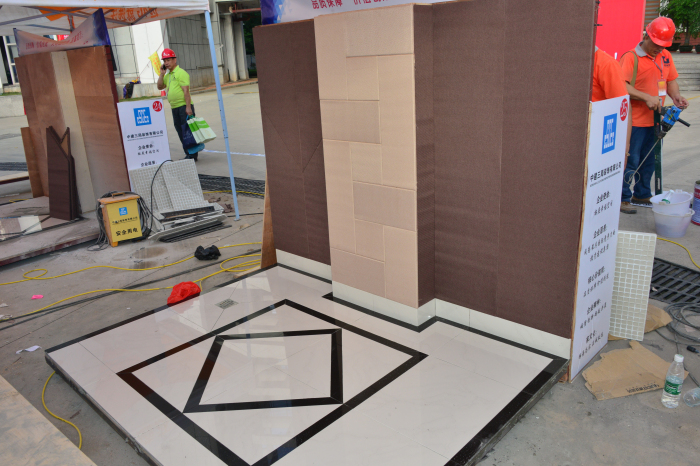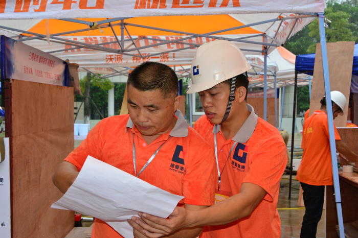 下午2:30,工人們稍事休息后重新投入比賽,繼續上午未完成的工作。最后,建藝團隊以超高的效率率先完成一道考題,此時,大部分選手都還在施工進行中。