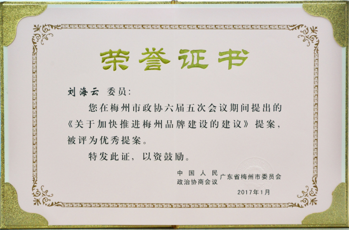 2017年1月9日,中國人民政治協(xié)商會議第七屆廣東省梅州市委員會第一次會議勝利召開,建藝集團董事長劉海云作為六屆政協(xié)委員參加七屆一次會議,并光榮當選新一屆政協(xié)常委和提案委員會委員。同時,劉海云董事長在2016年度政協(xié)提案《關(guān)于加快推進梅州品牌建設(shè)的建議》被評為優(yōu)秀提案,在會上獲得了表彰,劉海云董事長登臺領(lǐng)取了榮譽證書。
