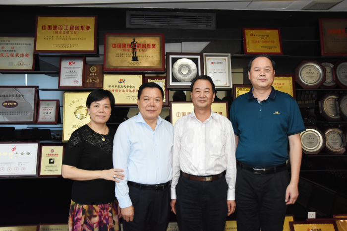 廣東省梅州市政協(xié)主席陳建青(右二)、副主席李忠良(右一)在建藝榮譽墻前同劉海云董事長及顏如珍副總裁合影