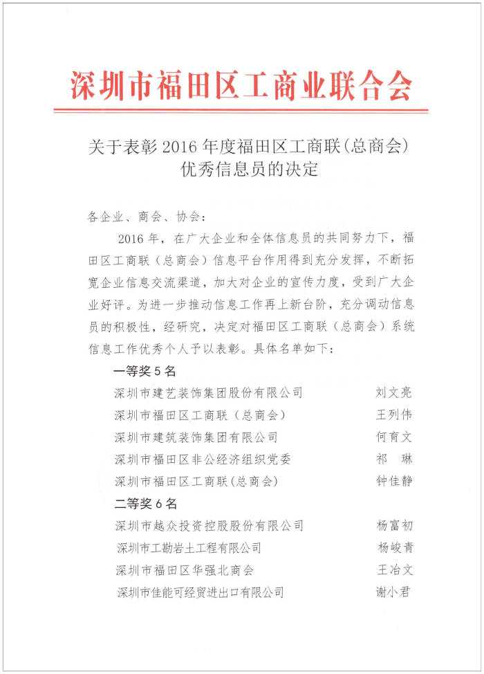 2016年度福田區工商聯(總商會)優秀信息員表彰揭曉 建藝集團蟬聯第一名