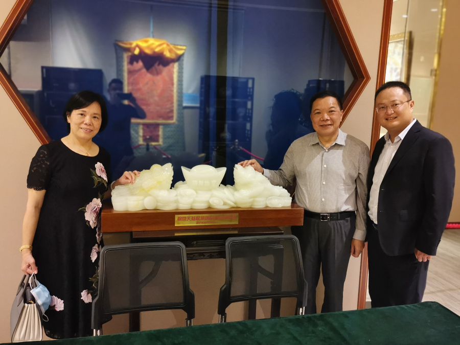 劉海云及顏如珍董事、孫昀董事在建藝集團贈送天基權集團的伊朗紅花冰玉雕前合影