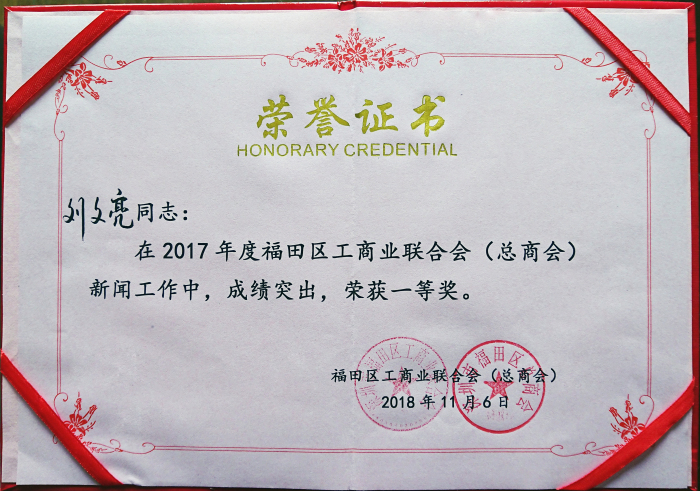 培訓(xùn)后,對2017年度福田區(qū)工商聯(lián)(總商會)優(yōu)秀信息員進(jìn)行表彰并頒發(fā)榮譽(yù)證書,建藝集團(tuán)榮獲福田區(qū)工商聯(lián)(總商會)新聞工作第一名,這是建藝集團(tuán)連續(xù)第三年蟬聯(lián)桂冠。