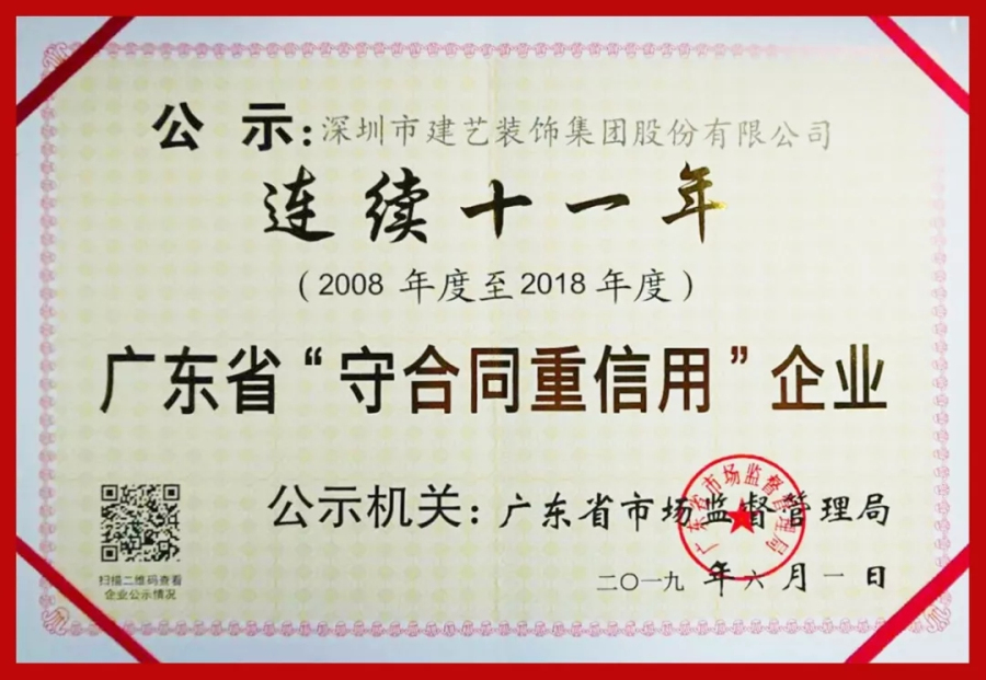 我們堅信:誠信是企業生存之本,是維護市場經濟秩序、確保企業經濟健康發展的重要保證。建藝集團能夠連續11年榮獲廣東省“守合同重信用”榮譽稱號,是政府和社會各界對建藝集團一如既往的誠信經營、品牌信譽建設的充分認可。以此為契機,展望未來的發展,建藝集團將繼續發揚“守合同重信用”精神,不斷深化自身信用體系建設,鞏固、加強隊伍的誠信自律,為不斷健全以信用為核心的新型市場監管機制做出努力。