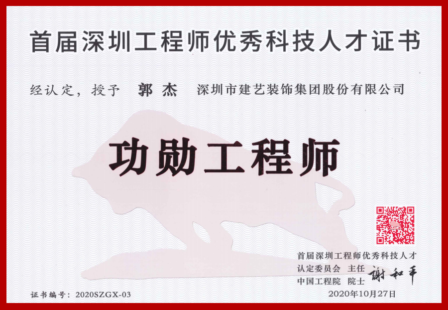 據悉,本次深圳工程師優秀科技人才認定工作由深圳市工程師聯合會、深圳市注冊建筑師協會、深圳市室內設計師協會等41家科技社團和單位聯合發起。設立同行評議、社會認可的嚴格標準,覆蓋26個工程界別,具有較強的代表性和公信力。而本次“功勛工程師”殊榮深圳市共評選五位,且都分屬不同行業領域,在深圳建筑裝飾工程領域只有郭杰院長一人獲此殊榮!