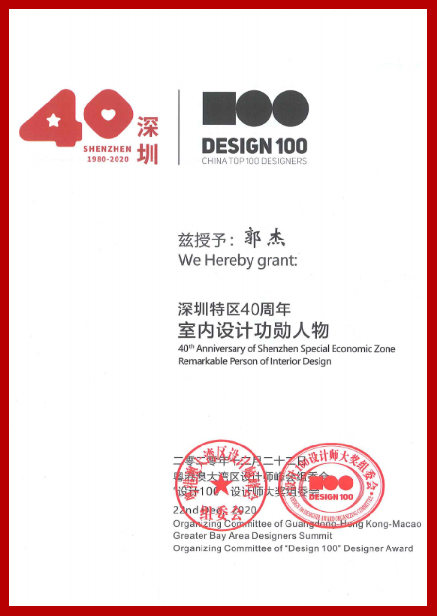 此次獲得“‘設計100’——深圳特區40周年:室內設計功勛人物”及“首屆深圳工程師優秀科技人才——功勛工程師”雙料殊榮,不僅是對郭杰院長及建藝集團設計研究院長期以來推動、促進、影響建筑裝飾設計領域蓬勃發展的認可與表彰,更是對“建藝設計”未來繼續高品質輸出,打造“深圳質量”繼續引領行業不斷前行的激勵與期盼。放眼未來,“建藝設計”將繼續在郭杰院長的領導下,秉承“匠心”,為“深圳品質”助力打造“美麗中國”之愿景而持續奮斗;不斷努力,為深圳“雙區”建設貢獻力量!