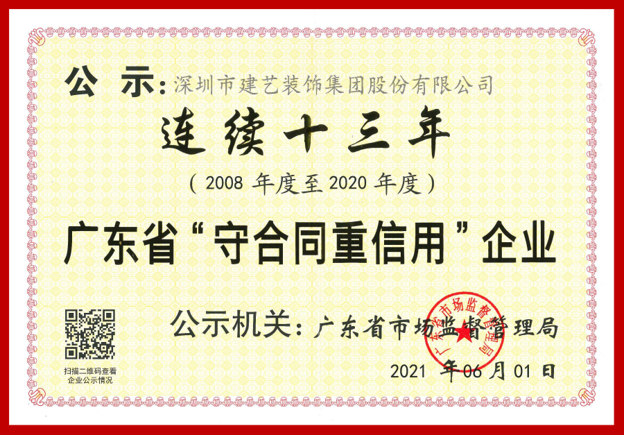 2021年,建藝集團(tuán)憑借自身良好的信用體系建設(shè)及誠信守約形象再次獲得社會(huì)肯定,連續(xù)十三年榮獲廣東省“守合同重信用”企業(yè)稱號(hào)!