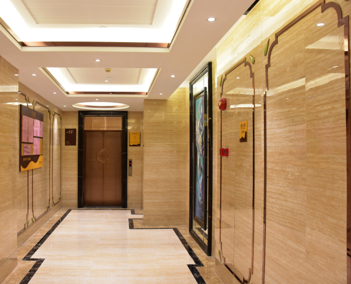 即便是地下入戶大堂和標準層電梯廳,設計上也極其講究,力求與首層大堂設計相呼應。地下入戶大堂墻地面全部采用仿大理石瓷磚,墻面同樣鑲嵌玫瑰金鏡面不銹鋼裝飾條配以藍寶石點綴,地面采用淺啡網及阿富漢黑金花瓷磚波打線,視覺效果強烈,線條感十足。標準層電梯廳墻面為大理石瓷磚搭配玫瑰金不銹鋼腰線,地面為大理石瓷磚拼花,天花則采用金箔飾面做舊工藝,整體交相輝映、不失尊貴。