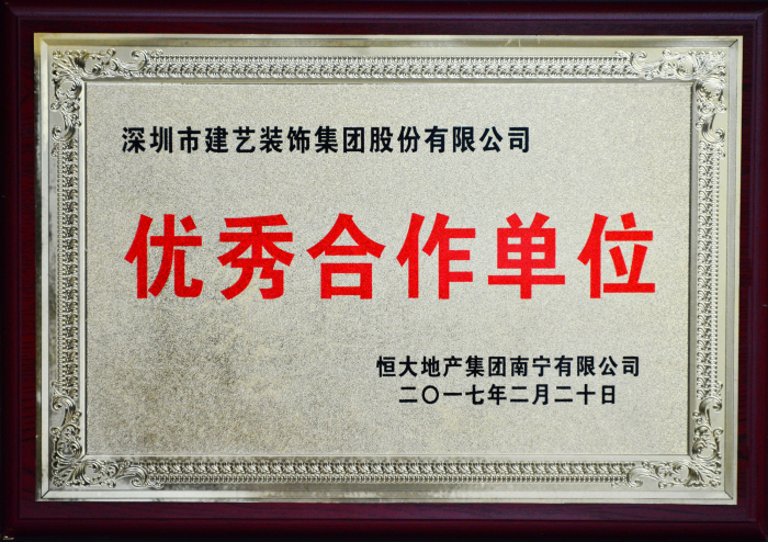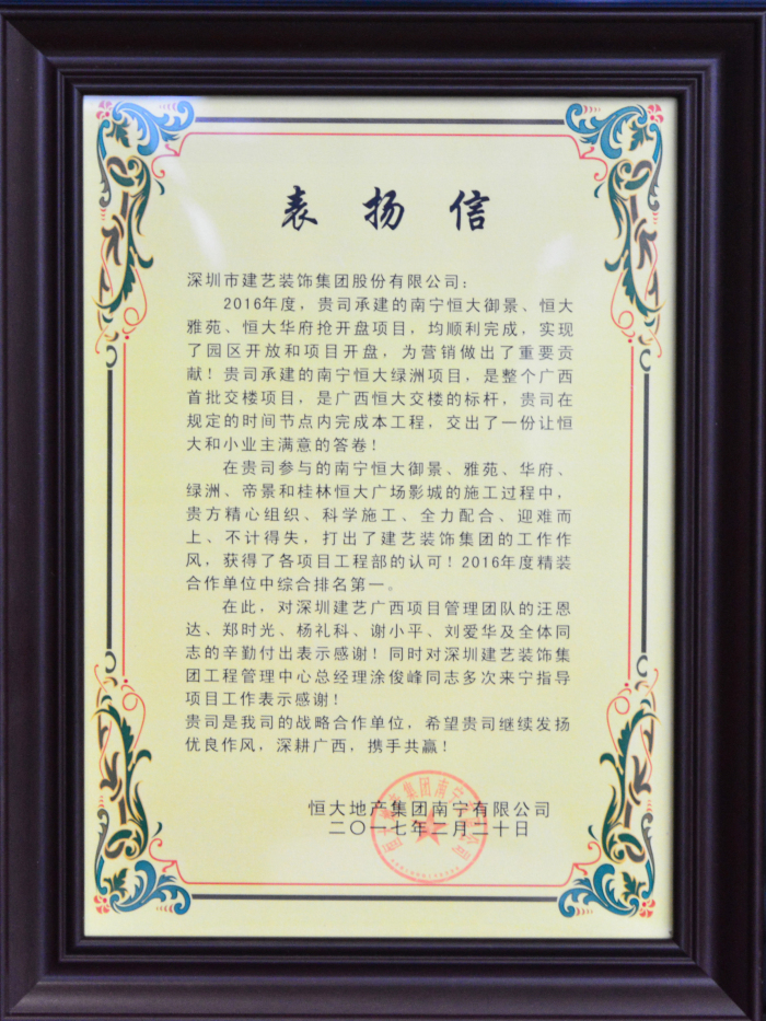 在我司參與的南寧恒大御景、南寧恒大雅苑、南寧恒大華府、南寧恒大綠洲、南寧恒大帝景和桂林恒大廣場影城等項目的施工過程中,我司工程管理人員精心組織、科學施工、全力配合、迎難而上,充分展現了建藝人的工作作風,得到了恒大南寧公司上下的一致認可及表彰,榮獲 “2016年度精裝合作單位綜合排名第一”、 “優秀合作單位”等榮譽獎牌及表揚信,為建藝集團贏得了榮譽!