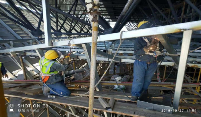 在施工過程中,有關該工程技術上的創新層面,樊華向我們介紹道:“山西太原濱河體育中心改擴建工程施工過程中,由于建筑物的屋頂主體是大跨度的網架結構,存在外力荷載作用,網架變形的實際情況。項目經理鐘正成在深化設計中,采用了雙向鉸接機構,既可傳遞幕墻水平荷載,又可適應屋面的位移,在幕墻與屋面隔墻間采用風琴橡膠板連接,一方面可保證幕墻的密封性能,另一方面可保證幕墻面板不被屋面較大的變形所破壞。鋼架底部的柱腳也在深化設計中既考慮了水平荷載和豎向荷載的安全功能性,又兼顧了室內外的美觀性,采用了鉸接連接與焊接相結合的工藝,此項設計得到了建設單位及設計院的一致認可并給予高度贊揚。”