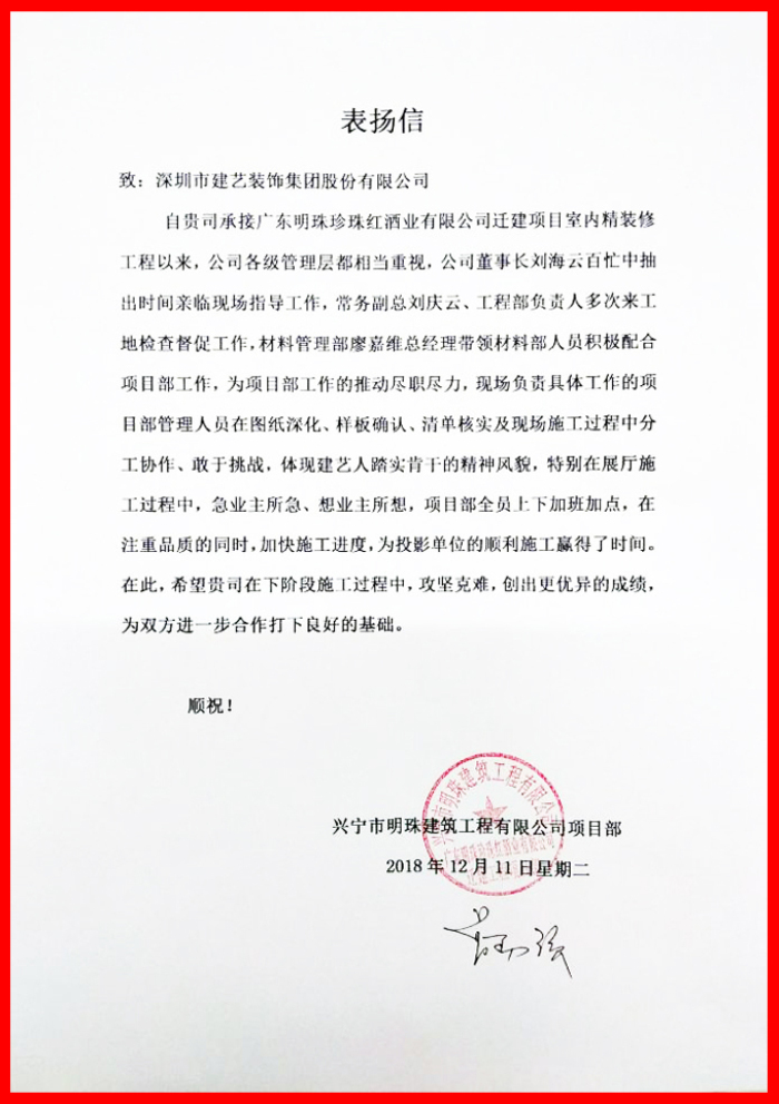 廣東明珠珍珠紅酒業有限公司遷建項目建藝團隊獲表彰