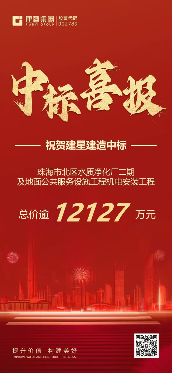 近日,深圳市建藝裝飾集團股份有限公司旗下子公司廣東建星建造集團有限公司(以下稱“建星集團”)喜獲中標:珠海市北區水質凈化廠二期及地面公共服務設施工程機電安裝工程,總價逾1.21億元。
