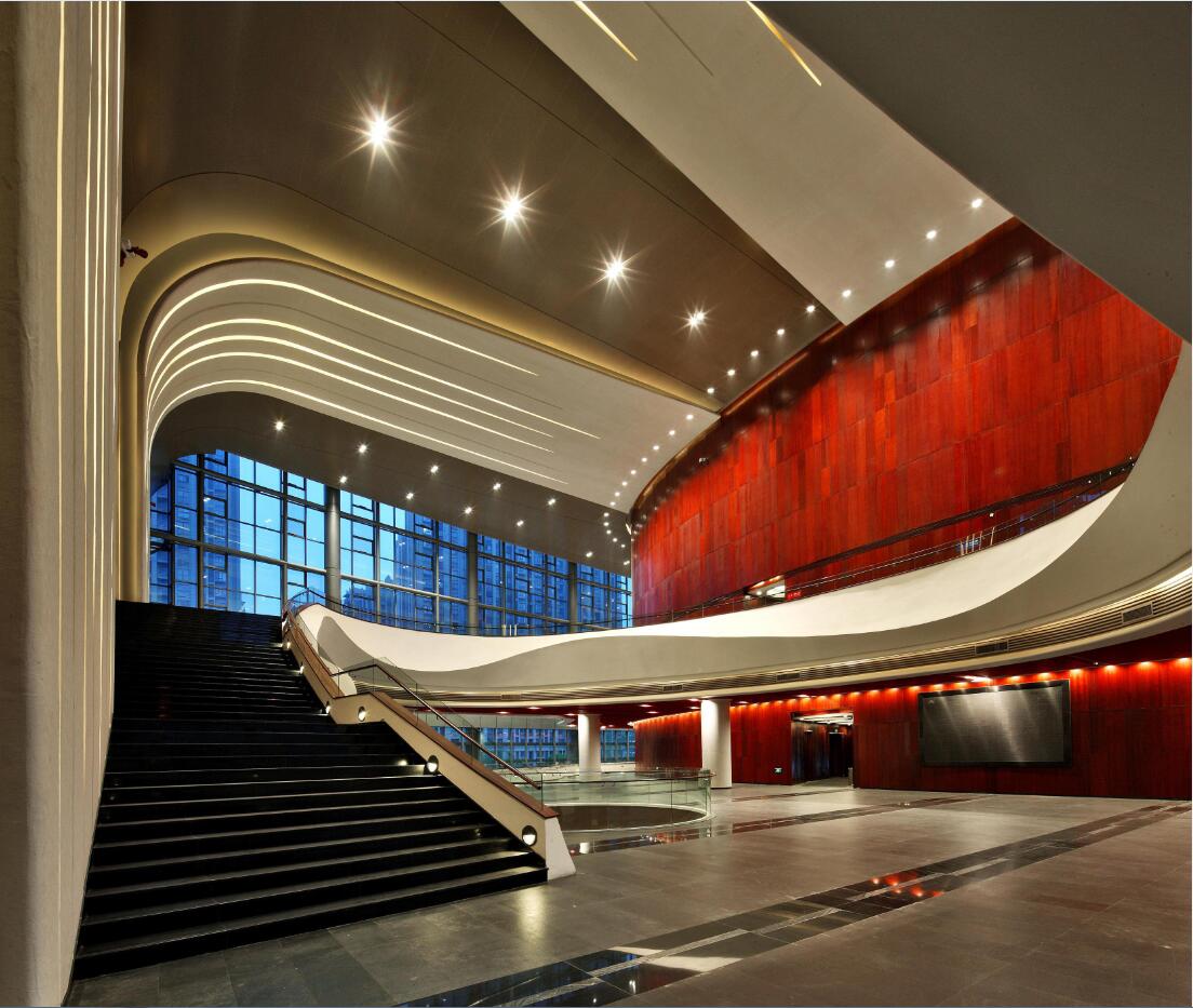 安徽廣電新中心西區大堂的室內設計是整體建筑中最具代表性的空間設計,大堂建筑空間恢宏大氣,三層空間挑高高達23米,主廳呈U形布局,三層流線型的回馬長廊貫穿之中,設計師充分挖掘了材質的特點,GRG材料造型欄板,打破了攔河給人的固有印象,創造性地使其展現扭曲變化的“韌性”造型,用抽象雕塑的手法表現了穿云破霧的“行龍”,仿佛有一種呼嘯著從遠處側廳奔騰而至的生命力,橫貫穿行在各空間里,充滿靈動和奮進的張力;體現出一種自由飄逸、奔放磅礴的氣勢;而與之呼應的是在側墻上三面巨大而舒展的翅形設計,暗藏的LED燈帶輝映其側,抽象地提煉出吉祥鳥“鳳凰”的翅膀形態,其與橫向穿行的“行龍”在豎向上相呼應,表現出一種龍興鳳舉、龍鳳呈祥的戲劇性效果,設計師通過對中國傳統元素的提煉及概括性的演繹,用現代、時尚的語素去表達主題,在空間視覺上給人強烈的沖擊力。