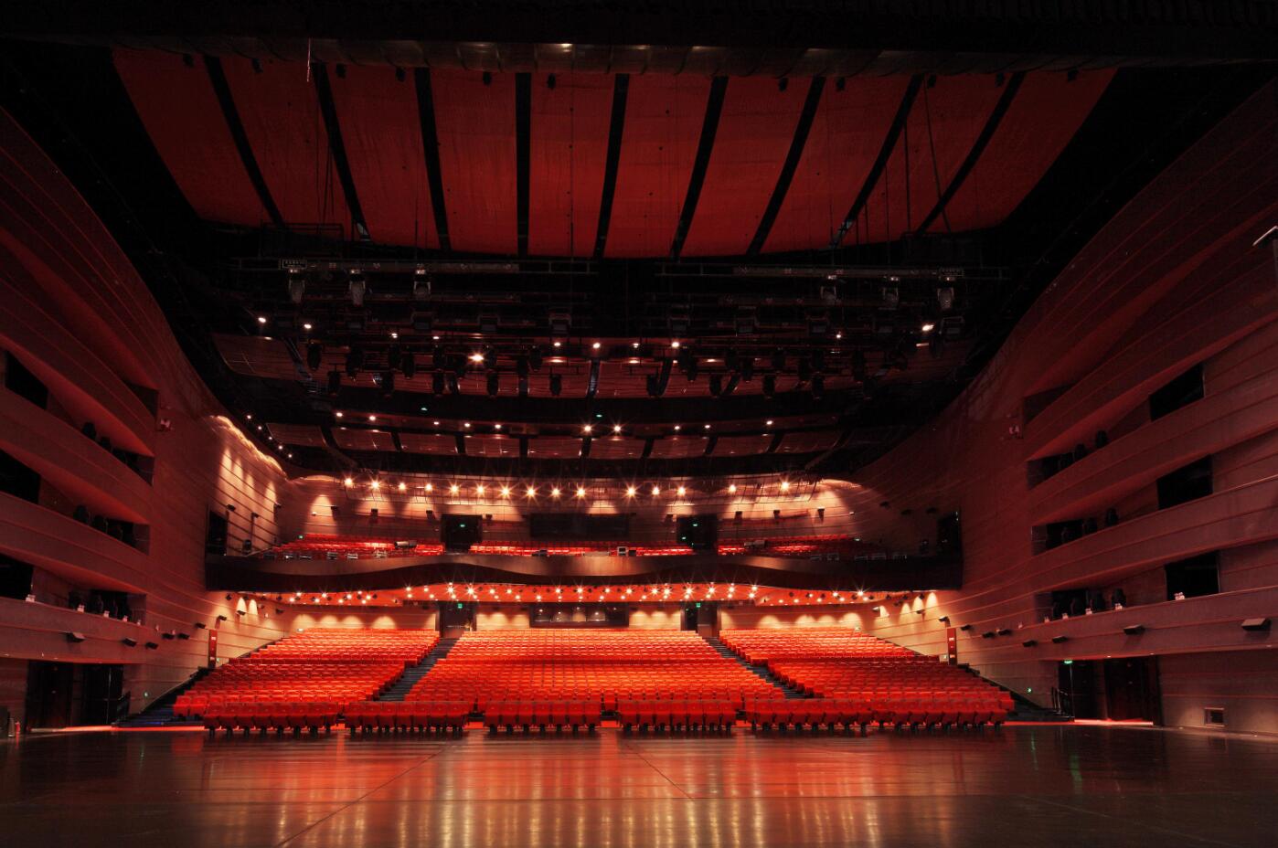 西區多功能演播廳是目前亞洲最大的專業演播廳,其專業舞臺面積達3600㎡,觀眾席1800座,其中固定坐席300座,劇場面積約9000㎡。運用了香檳色的剛質金屬張立構造網來作為主立面表層裝飾主材,大氣而舒展,其良好的穿透性,保證了其后面聲設計構造作用的最大發揮,使聲音的吸收與反射結構都巧妙地隱藏在統一的網層下,在立面上形成獨特的雙表皮裝飾造構,紅色的聲學造構內襯與香檳的金屬網在燈光的映射下,從不同角度折射出不同的光暈表情,使室內空間充滿韻味。在天花的裝飾設計上,同樣遵循了聲學設計的要求,在保證空場混響時間指標的前提下你在反射區域和吸收區域巧妙地進行裝飾,使用弧型的鋁質張立網懸吊構造,其黑色輕盈的造型與紅色厚重的GRG聲學反射板相融合,讓觀者在視覺與感觀上產生一種沖撞與對比的感受,并且兩種形態又能很好的融合在整體的天花造型中,實現了天花裝飾設計上功能性與美觀性的和諧統一。