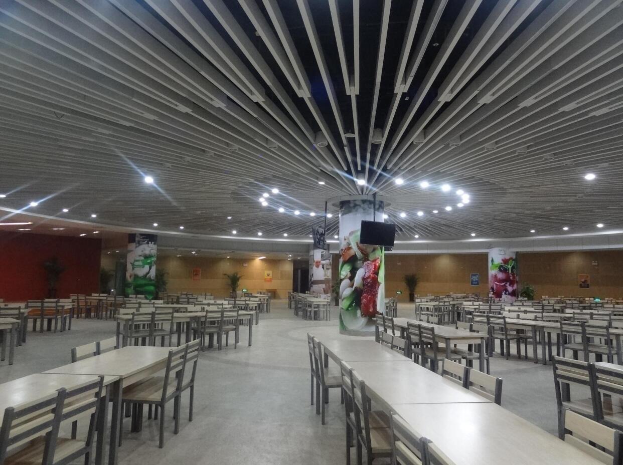 員工餐廳及辦公樓各樓層區域在設計上大量使用環保節能的材料,做到低材廣用,大氣簡約,又在大整體中見細節的精致。地面為拼花橡膠地板,頂面為圓形鋁方通造型頂,活潑的照明方式、相呼應的造型吊頂,讓員工在用餐之余,有不一樣的視覺體驗。