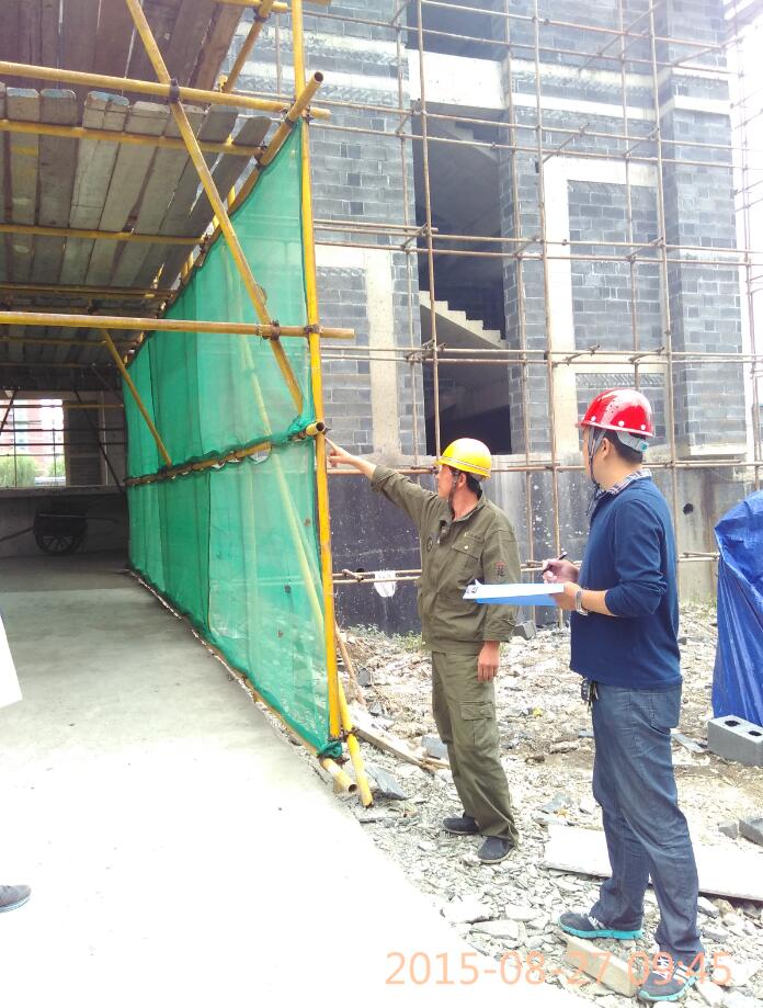 第三,對(duì)腳手架、防護(hù)棚進(jìn)行全面排查,重點(diǎn)檢查立桿基礎(chǔ)、排水措施、拉結(jié)點(diǎn)設(shè)置以及懸挑梁錨固等情況,并采取防風(fēng)防雨加固措施,確保穩(wěn)固、牢靠。同時(shí)對(duì)腳手架上堆放的建筑材料、建筑垃圾及建筑樓層臨邊堆放的材料進(jìn)行清理,做好防墜物的防護(hù)措施,外腳手架上不必要的附著物應(yīng)予以拆除。