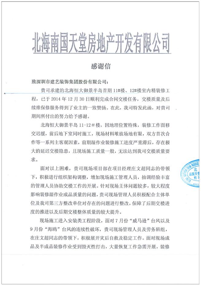 北海恒大御景半島首期11、12#樓室內精裝修工程表揚信