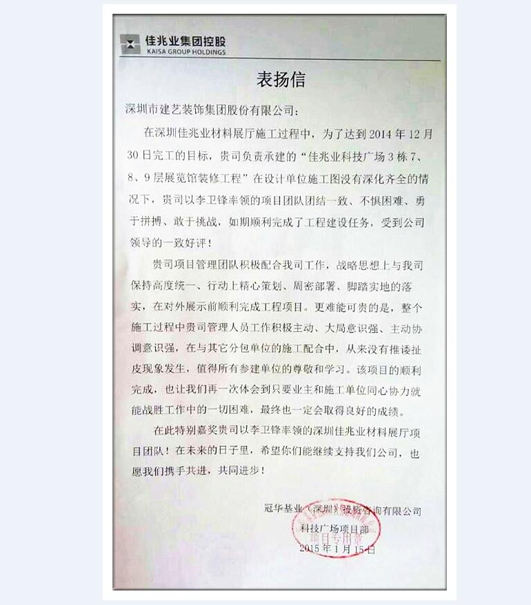 日前,由建藝集團(tuán)李衛(wèi)鋒團(tuán)隊負(fù)責(zé)裝飾施工的佳兆業(yè)科技廣場展覽館項目如期竣工。施工期間,面對著一系列的困難與挑戰(zhàn),李衛(wèi)鋒團(tuán)隊集思廣益,攻堅破難,保質(zhì)保量的“大戰(zhàn)”45天,團(tuán)隊成員們更是團(tuán)結(jié)一致、不懼困難、勇于拼搏、敢于挑戰(zhàn),用自身的實際行動確保了工程任務(wù)的如期完工,受到了佳兆業(yè)集團(tuán)相關(guān)領(lǐng)導(dǎo)的贊譽(yù)與好評,充分展示出了建藝集團(tuán)工程人員的高度責(zé)任意識與專業(yè)施工水準(zhǔn),體現(xiàn)了建藝集團(tuán)積極推廣項目科學(xué)、合理、先進(jìn)施工質(zhì)量管理經(jīng)驗,打造建藝標(biāo)準(zhǔn),鑄造建藝品牌的工程施工宗旨。