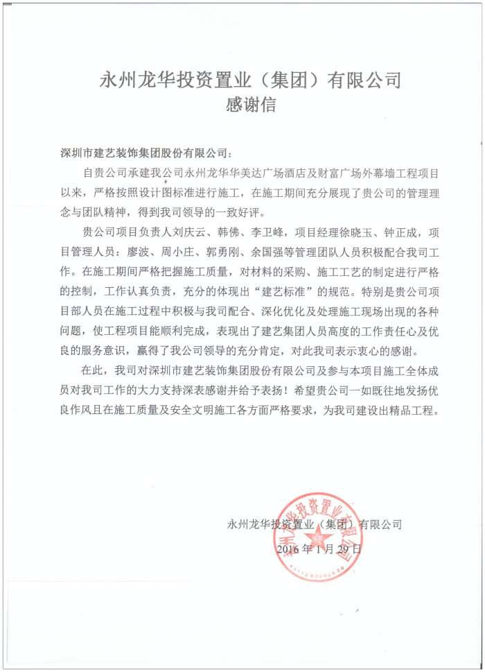 關于永州龍華華美達廣場酒店及財富廣場外幕墻工程的表揚信