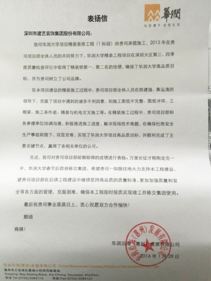建藝集團華潤大學項目精裝修工程(1標段)項目部受表彰
