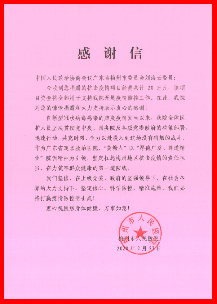 日前,梅州市委、市政府及梅州市人民醫院分別向建藝集團發來感謝信,感謝梅州市政協常委、建藝集團董事會主席劉海云率企業在疫情防控關鍵期,通過捐贈口罩、善款等一系列大愛善舉,積極為梅州地區疫情防控提供幫助,并對梅州市疫情防控工作注入了強大動力。