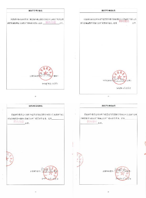 此外,建藝集團立足為項目施工解決重難點問題,自主創新研發的4項科技成果經廣東省建筑業協會評價委員會評定:《裝配式大面積密縫金屬吊頂施工技術》《石材鋁蜂窩板雙向固定式干掛施工技術》達到國內領先水平,《高大空間蜂窩吸音板墻面安裝技術》《新型抗堿防潮海基布墻面綠色施工技術》達到國內先進水平。