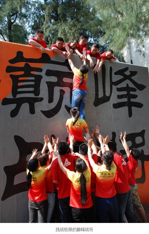 當教練宣布完挑戰規則后,建藝人集體陷入沉思,在大家的心中都有這樣一個疑問:單憑“人墻”,我們能完成挑戰嗎?看到蔓延在團隊中的顧慮陰霾,作為本次挑戰領隊的集團常務副總裁田力與共同參加挑戰的行政管理中心總監趙紂瑜共同制定了挑戰策略,并在最短時間內將隊伍分工,確定人墻人員及攀爬人員,通過對團隊資源的合理分配,迅速調整了團隊成員們的心理狀態?!拔覀円欢艹晒?!”的堅定信念更是將先前的顧慮陰霾一掃而光。在教練一聲令下后,第一名攀爬人員在人墻的幫助下迅速爬上墻壁,打響了這場終極挑戰的第一槍!