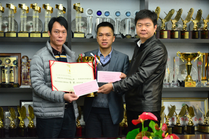 建藝集團副總裁趙紂瑜(右一)代表集團向陳計明(左一)及郭勇剛(左二)頒發獎金以示鼓勵