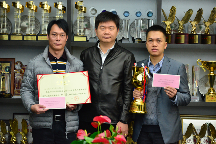 鑒于工程管理中心陳計明、郭勇剛等人在11月深裝協舉辦的“2016年深圳技能大賽暨首屆深圳市建筑裝飾職業技能競賽”決賽中憑借一流的表現與優秀的團隊配合,斬獲“團體季軍”及“個人三等獎(鑲貼工項目)”,為集團贏得了榮譽,用成績詮釋了建藝人精湛的工匠技藝與嚴謹務實工作作風。1月16日,建藝集團副總裁趙紂瑜代表集團,向陳計明、郭勇剛二人頒發獎金,以示鼓勵。